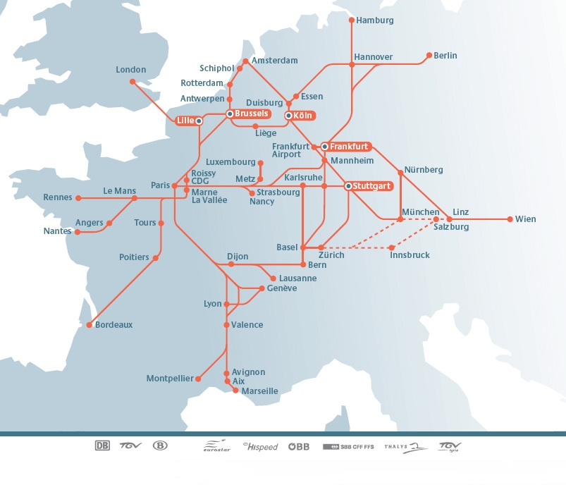 Paris - Stuttgart : 3h40 November 2007 : Predĺženie trate medzi Londýnom a Eurotunelom (High Speed 1) skráti cestovný čas o 20 minút.