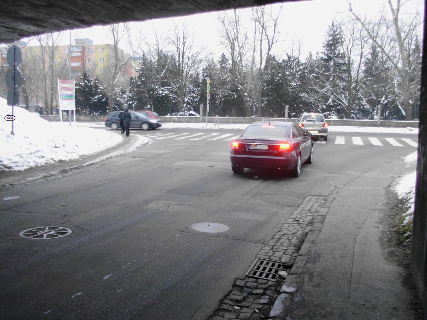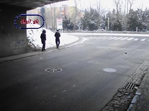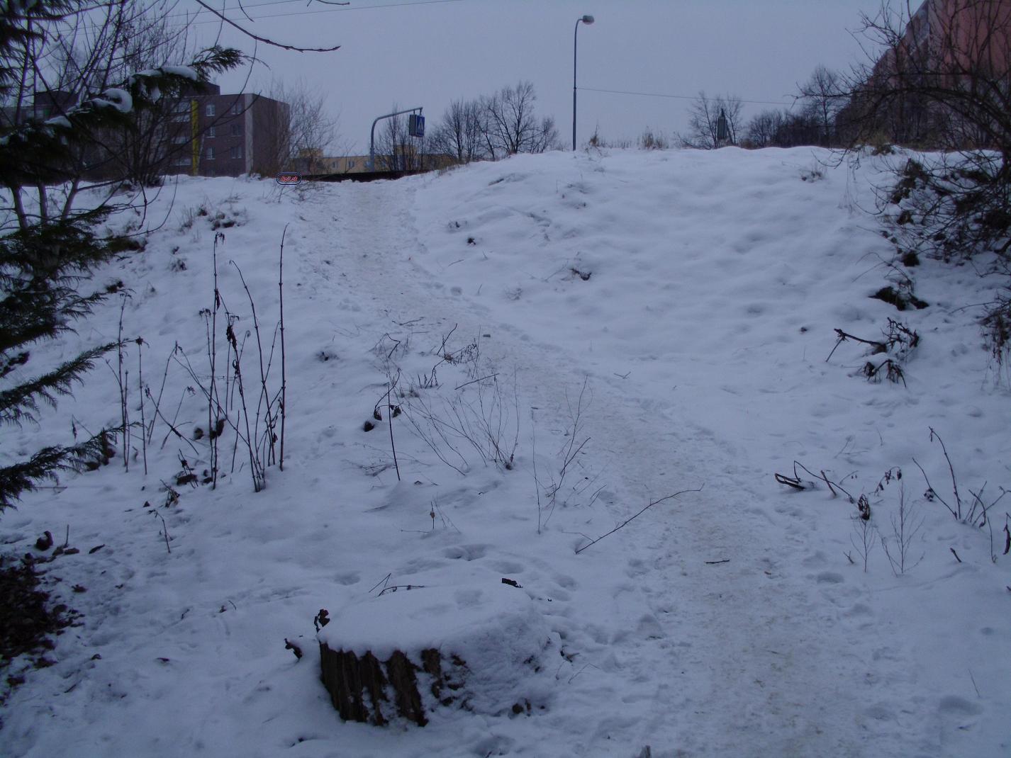 Podjazd trate s 2 chodníkmi 1 m širokými na Krasinského ulici (mapa 2: bod 1) - podľa P.Vaškoviča to nie je: " možnosť pre peších-chodcov v tomto úseku, ako využiť len vyšliapané chodníčky":