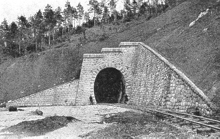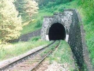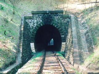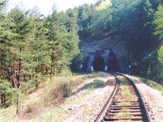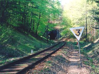 | Vstup trate do tunela, foto Emil Schenk, 29.4.2001 | Portál tunela, foto Emil Schenk, 29.4.2001 |