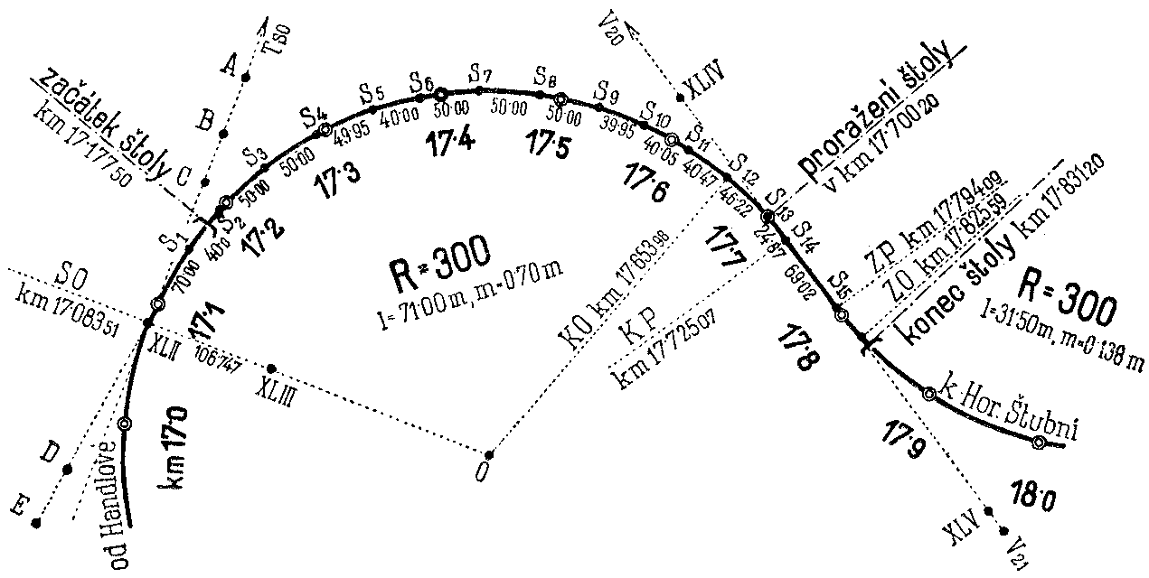Polygónové body S1 až S11, KO a S12 vytýčené polárnou metódou v najväčších vzdialenostiach asi 50 m, aké dovoľovala svetlá šírka štôlne, sú uvedené vo vytyčovacej schéme. Na hornoštubnianskej strane sa vychádzalo od tečny V21, V20, ktoré boli zaistené bodmi XLIV. a XLV., a od nej vytýčené body S15, S14 a S13. Ďalšie medziľahlé body boli vložené z polygónových stanovísk polárnou metódou. Os je posunutá dovnútra oblúka osi koľaje o 25 cm.