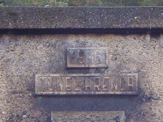 | Časť fotogrametrickej snímky portálu | Letopočet obnovy (1946) a meno tunela na čele portálu foto Emil Schenk, 14.10.2001 |