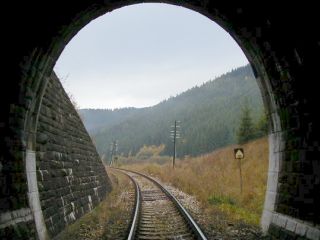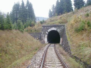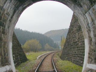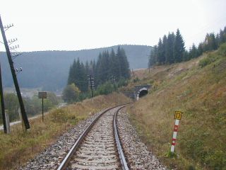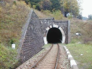 | Vstup trate do tunela (km 61,0), foto Emil Schenk, 6.10.2002 | Portál tunela (km 61,1), foto Emil Schenk, 6.10.2002 |