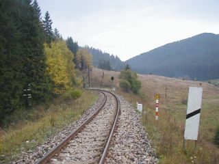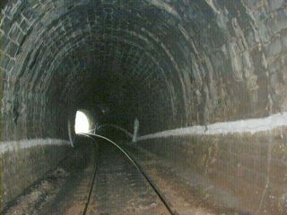 | Vstup trate do tunela, vľavo tabuľa, foto Emil Schenk, 6.10.2002 | Portál tunela, klesanie 8‰/170, foto Emil Schenk, 6.10.2002 |